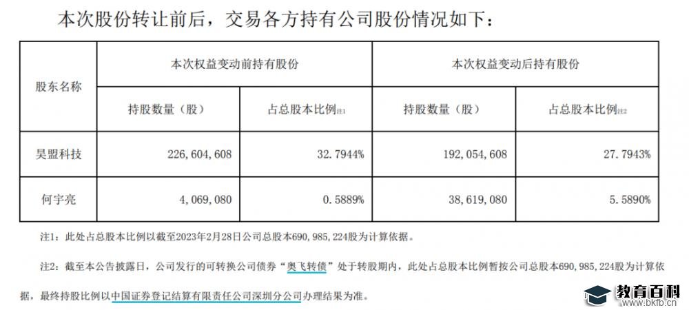 本次股份转让完成后,昊盟科技将持有1.92亿股公司股份,占公司总股本的27.79%股份;何宇亮将持有3861.9万股公司股份,占公司总股本5.589%。