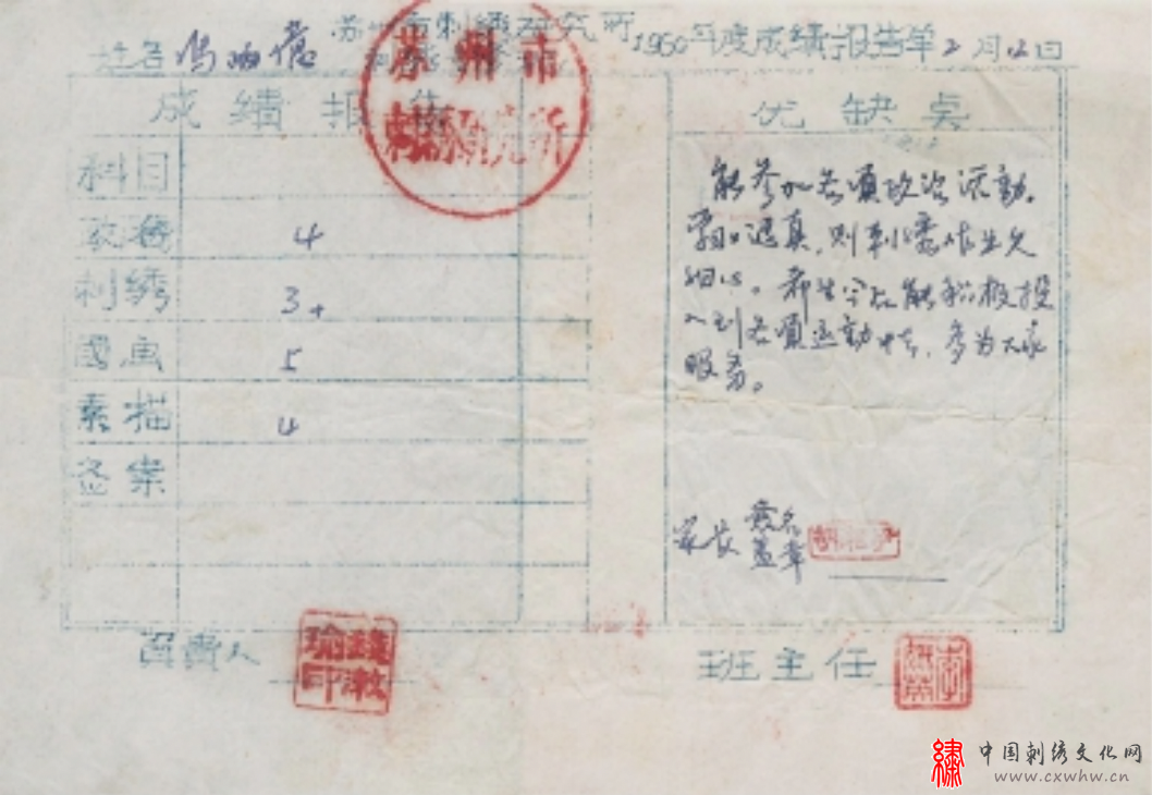 1958年3月,为传承苏绣传统技艺,培养一批能画能绣的技艺人才,苏州市工艺美术研究室举办首届刺绣专修班,共招收16名小学、初中毕业生,分乱针、打点戳纱、平金打籽、创作设计、细绣5个专业,学员毕业后全部留在刺绣研究所工作。