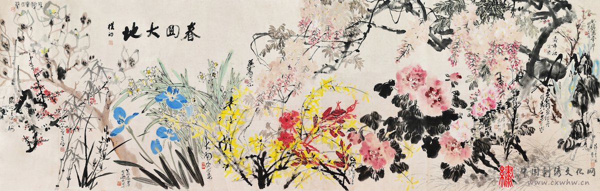 展厅中央,一件由李苦禅、关山月、王个簃、程十发、黄胄、朱屺瞻、陈大羽、唐云、萧淑芳、徐绍青、张继馨、张辛稼、李琼久绘稿;赵朴初题词的绣稿《春回大地》吸引了众多观众的驻足。“这次南北东西十二位画家为苏绣执笔,合作此图,是中国刺绣历史上罕有的奇迹。他们中有的搁笔十年,有的久病初愈,年老者达八十七高龄,年少者也逾半百,均有深厚高超的艺术成就。”苏州刺绣研究所游伟刚在现场回忆说,“当时先去的上海拜访王个移、唐云、朱屺瞻等书画名家。因为那个时候‘文革’刚刚结束,画家们都有着创作激情。当时给每个画家带去了苏州的特产碧螺春茶叶,以感谢他们的支持。”