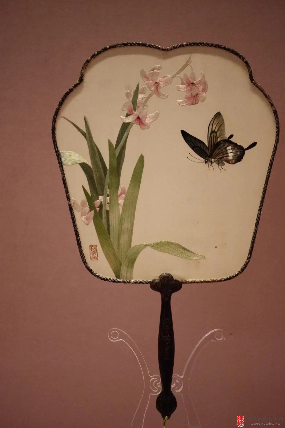 “苏绣艺术文献展(1949—2019)”展览现场 苏州刺绣研究所 《刺绣团扇》 20世纪80年代