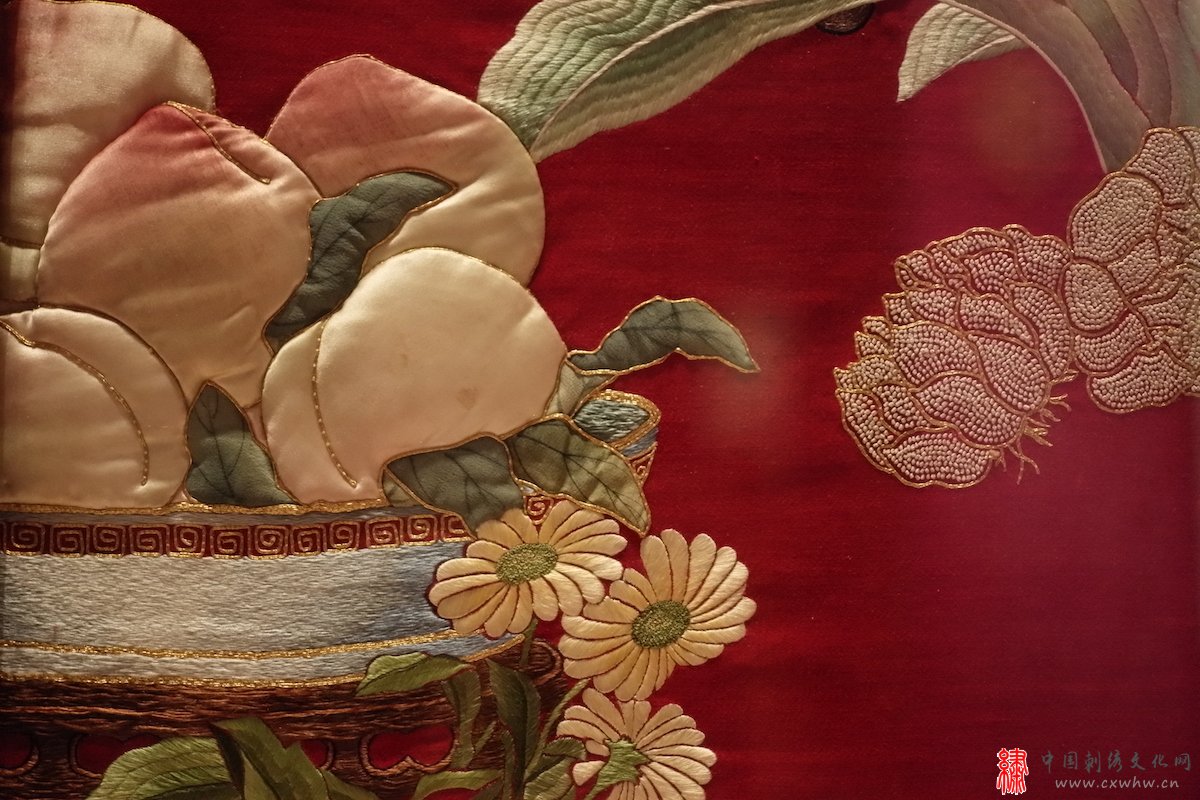 “苏绣艺术文献展(1949—2019)”展览现场 顾文霞、李娥英(绣制) 单面绣《万寿无疆》(局部)