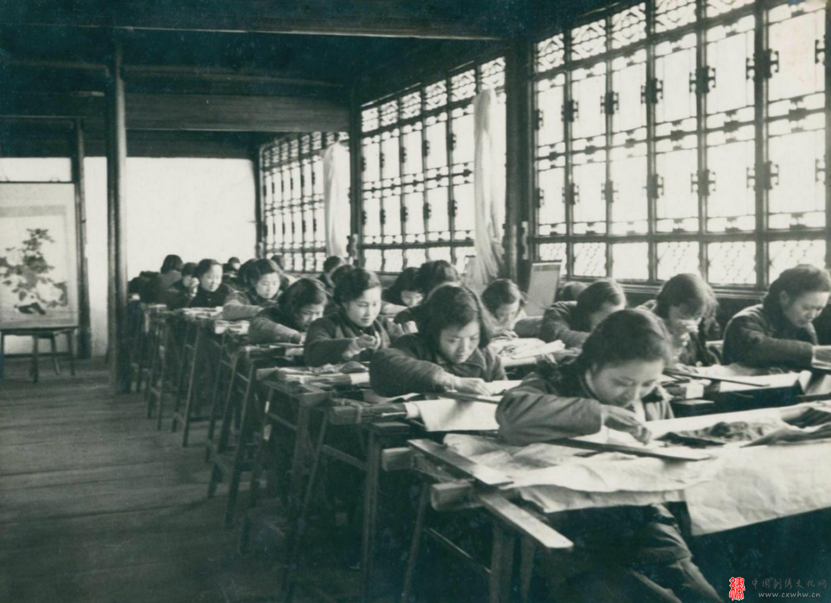 1955年,苏州工艺美术刺绣生产合作社工作场景