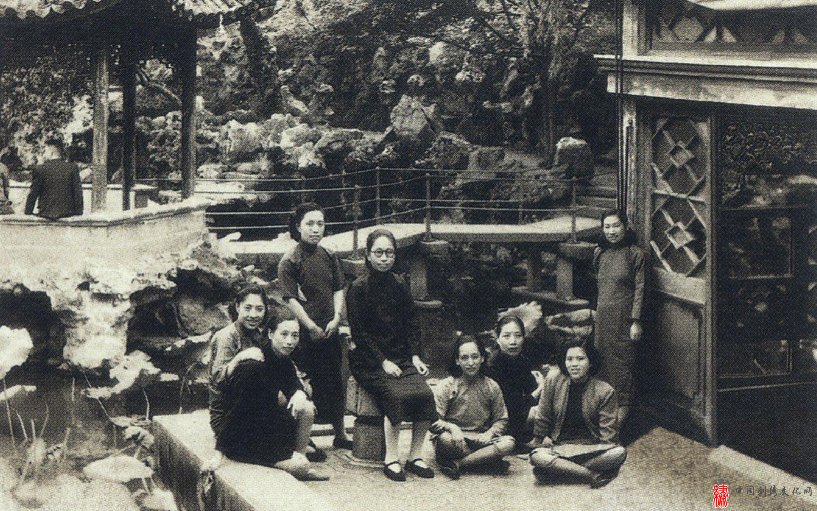 1951年,人像绣刺绣小组于狮子林合影 从左至右分别为任嘒閒、朱凤、章评声、杨守玉和周巽先