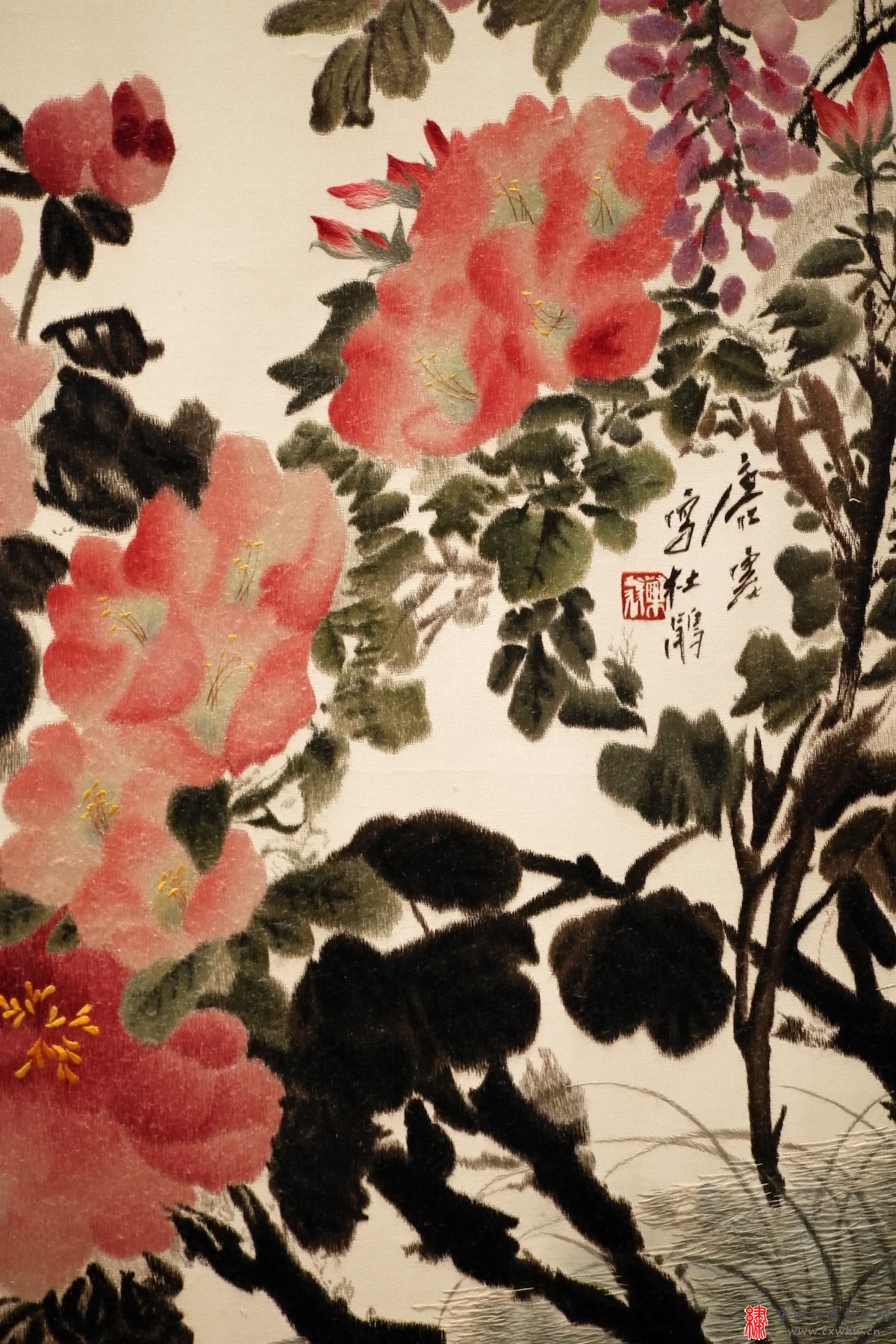 与之对应展出的是单面绣《春回大地》,这是刺绣艺人在全面理解画家笔墨意韵的同时,运用苏绣施套针、虚实针等创作出来的,绣稿上,艺人把群芳竞艳、春光盎然的旨趣表现得淋漓尽致。据现场一并展出的科技档案《春回大地》记载,原稿中李琼久的画因故没有用,后改用了张继馨的月季。绣制过程中主要解决两个技术问题,一是在针法上进行改革,采用施针与散套针相结合,必要时采用乱针加色;二是反复试绣,探索符合花卉生长规律与用笔转折相结合的丝理组织,使绣品既能充分表现写意画的笔墨意味,又可充分发挥刺绣的丝光效果。