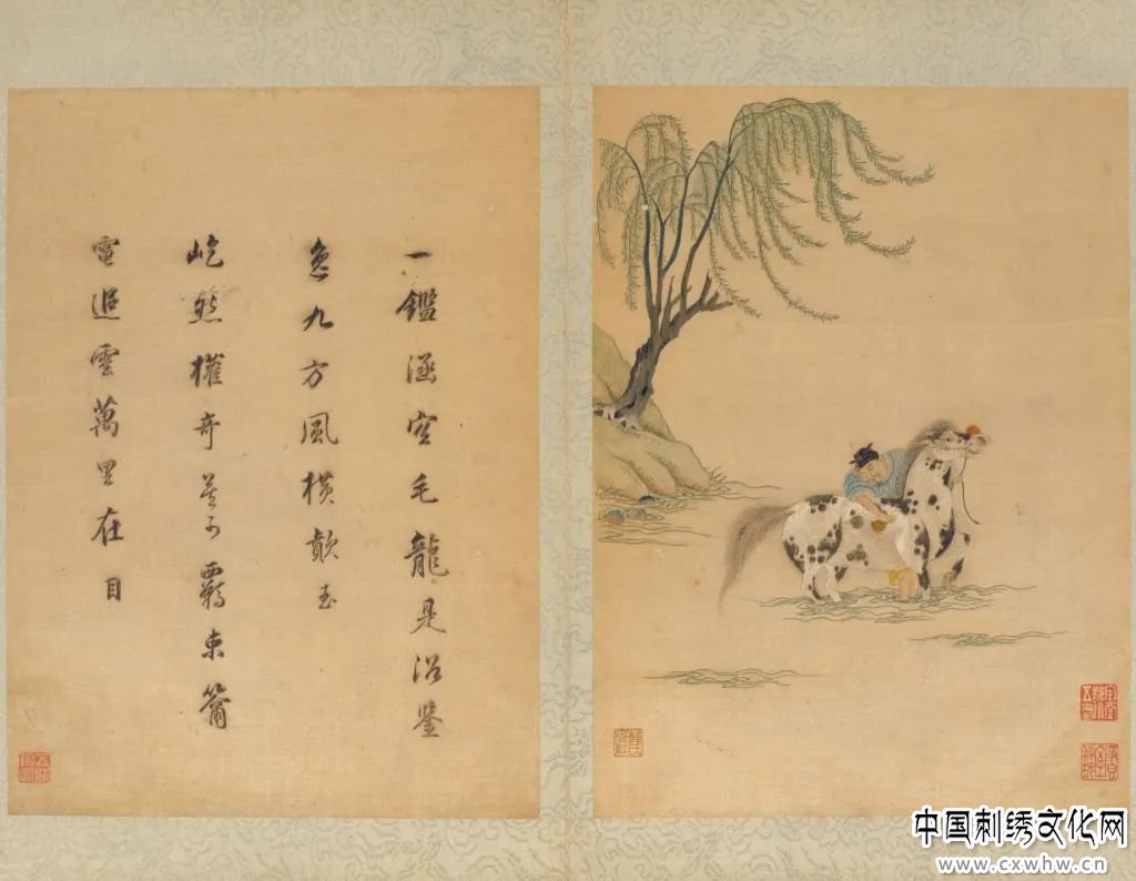 《洗马图》是在白色素缎地上绣成,画面上垂柳摇曳,树下一马夫正为一白色黑斑马刷洗,白马兴奋地在水波中昂首嘶鸣。此幅绣作完全模仿绘画的笔法用针刺绣而成,雄健的白马以顾绣中最擅长的擞和针顺其肌肉的纹理绣成,逼真写实。白马身上的斑点则完全依照绘画中的点绘法绣成,虽然黑色绣线已脱落,但其针法仍依稀可辨。此外,绣画中也多处用笔渲染,这种“半绘半绣”、以绣为主、辅之以画的手法是顾绣最基本的特征。