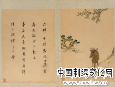 此图为《韩希孟绣宋元名迹册》之第二幅,在白色绫地上绣成。绣品描绘一只梅花鹿于桂花飘香的岸边悠闲踱步。在画面上,桂花树仅露有部分树底和枝叶,余则略去,但树底和枝叶两相呼应,仍使人感觉其形象之完整。小鹿以暗褐色皮毛配以黑色鹿角、白色斑点和炯炯的双目,活泼机敏,神采奕奕。鹿身以平套针绣出,毛发丝丝细密,纹理清晰毕现。水中寿石呈镂空状,用抢针法以深蓝、湖蓝和浅蓝晕色表现石之轮廓,间施浅绿、浅橙和淡黄色,虚空轻灵之象顿现。岸边之石则以散套针法为主,辅以点染,颇具水墨效果,具厚实之感。如此虚实相间,轻重有衡,明暗互补,使画面有灵动畅达之韵。