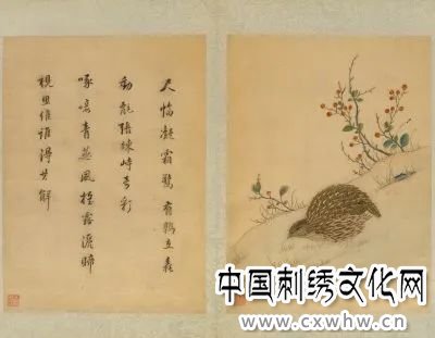 此图为《韩希孟绣宋元名迹册》之第四幅,在白色绫地上绣成。画面描绘了一只在山坡上低头觅食的鹌鹑。山坡的线条精细秀劲,山石花草构图得当。鹌鹑的毛羽用施毛针针法细密地绣出,背部硬毛、颌下和腹部软毛质感强烈;脚爪使用钉针针法,肢节分明。绣品运用丝理变化表现物象的质感肌理,细腻逼真,极富立体感,栩栩如生的禽鸟呼之欲出。整幅画面以鹑鸟羽毛的绛褐色为主色调,同时又配有绿叶红果,以之调谐偏暗的色彩,使画面豁亮而生趣盎然。这一技法的处理反映出作者不仅对物象造型有精确的把握,而且对色彩运用有着敏锐的感觉和深刻的悟解,从而增强了作品的艺术魅力。