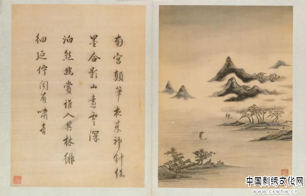 此图为《韩希孟绣宋元名迹册》之第五幅,系摹临米画在白色绫地上绣绘而成。绣品通幅浓墨染绘,远处峰峦起伏,山间有数抹淡染的云烟,层林笼罩在烟霭之中。画面表现出“夜雨欲霁,晓烟既泮”的景色,渲染出江南山川水气蒸郁、烟岚弥漫的湿润和流动感。江中帆船点点,戴笠披簑的渔翁于船头若隐若现。近处汀洲草木晰然,生机蓬勃。在画面构图上,远虚近实,详略有致,远处山峰的尖峭与近处汀洲的平长相得益彰,以空间的平衡获得了视觉的美感。尤其是江中片帆的置设,颇有画龙点睛之效,风帆的满鼓与张扬显示出刚劲的生命力,在一片淡云柔水、幽淡闲逸的氛围中分外醒目,这或许正是作者心境的体现。