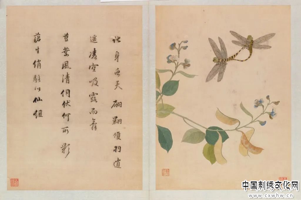 对页为董其昌题诗:“化身虫天,翩翾双羽。逍遥凌空,吸露而舞。豆叶风清,伺伏何所。影落生绡,驻以仙组。”